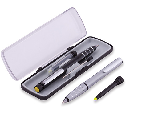 DESCRIPCION: Metal. Cuerpo de color. Detalles en color Plata. Clip y puntera metálicas. Apertura giratoria. Tinta negra. Incluye resaltador fluorescente amarillo en parte superior con apertura de rosca, 1 repuesto de tinta negra y 1 repuesto de resaltador. Estuche plástico con tapa transparente. Destape plateado al grabar.